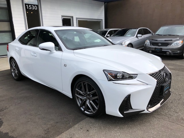 While the mid-level IS 300 gets a 255-hp 35-liter V-6 and the top IS 350 uses a 306-hp 35-liter V-6. Front-engine rear-wheel-drive 5-passenger 4-door sedan. Finished in ultra white metallic over black leather interior f sport tuned suspension silver performance trim aluminum sport pedals sport paddle shifters sport shift knob comfort access key less go with push start twin projector led head lights f sport front fascia and.